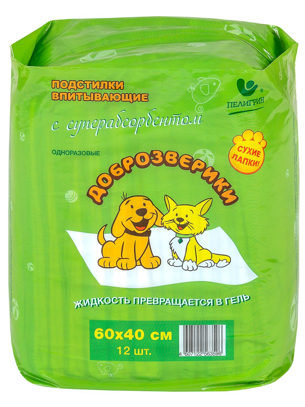 Доброзверики подстилки впитывающие для животных с суперабсорбентом 60х40 см, 12 шт. "Сухие лапки"