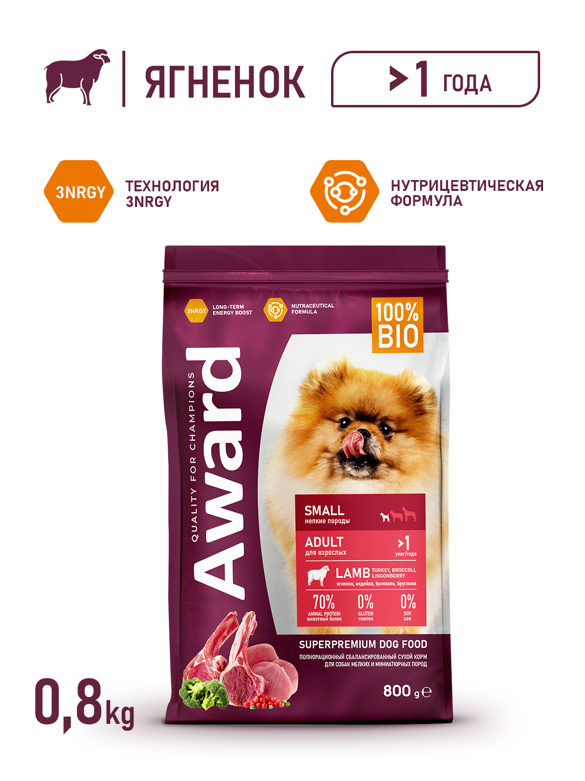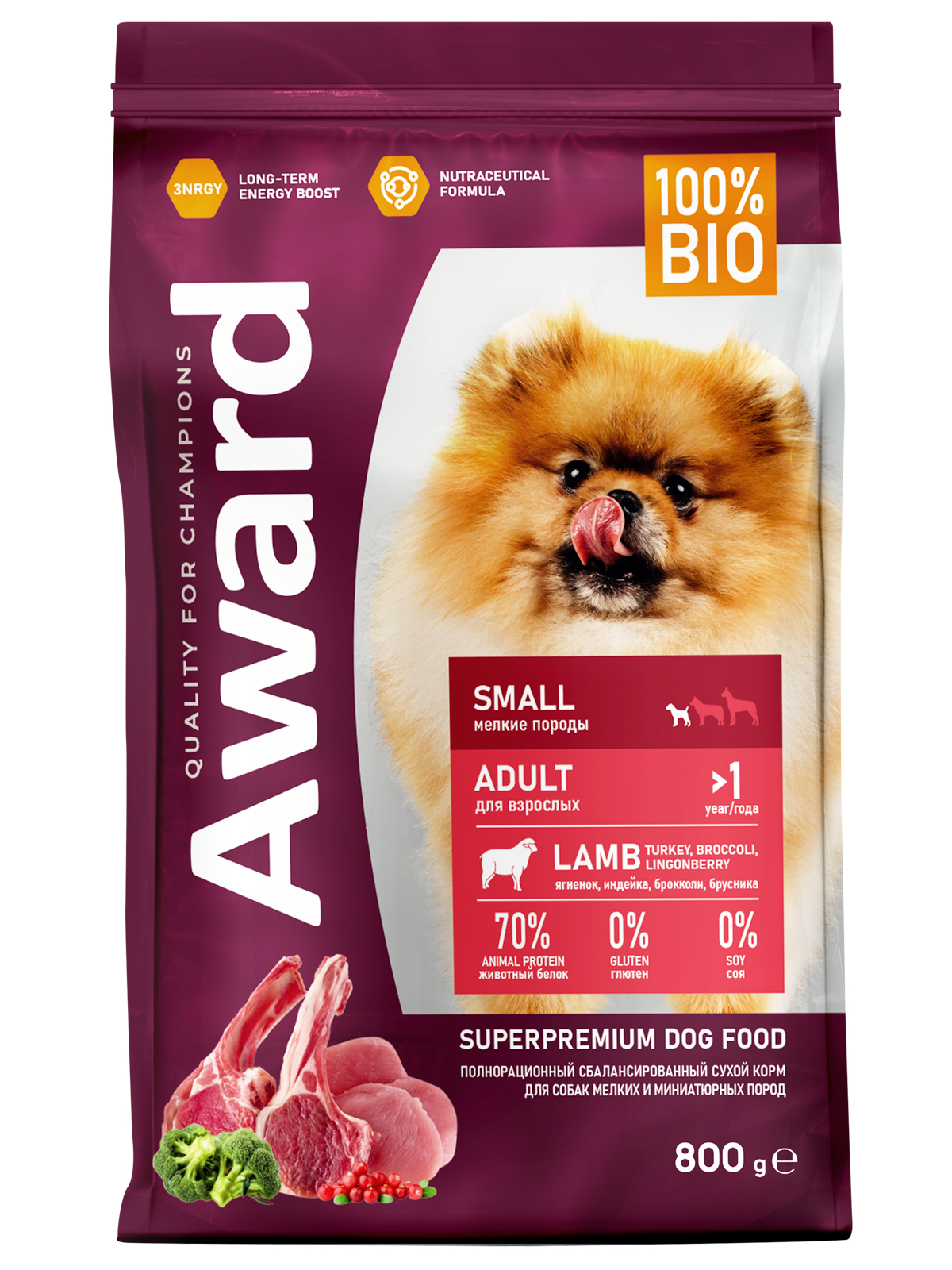 Сухой корм AWARD для взрослых собак мелких и миниатюрных пород с ягненком и индейкой с добавлением брокколи и брусники 800г