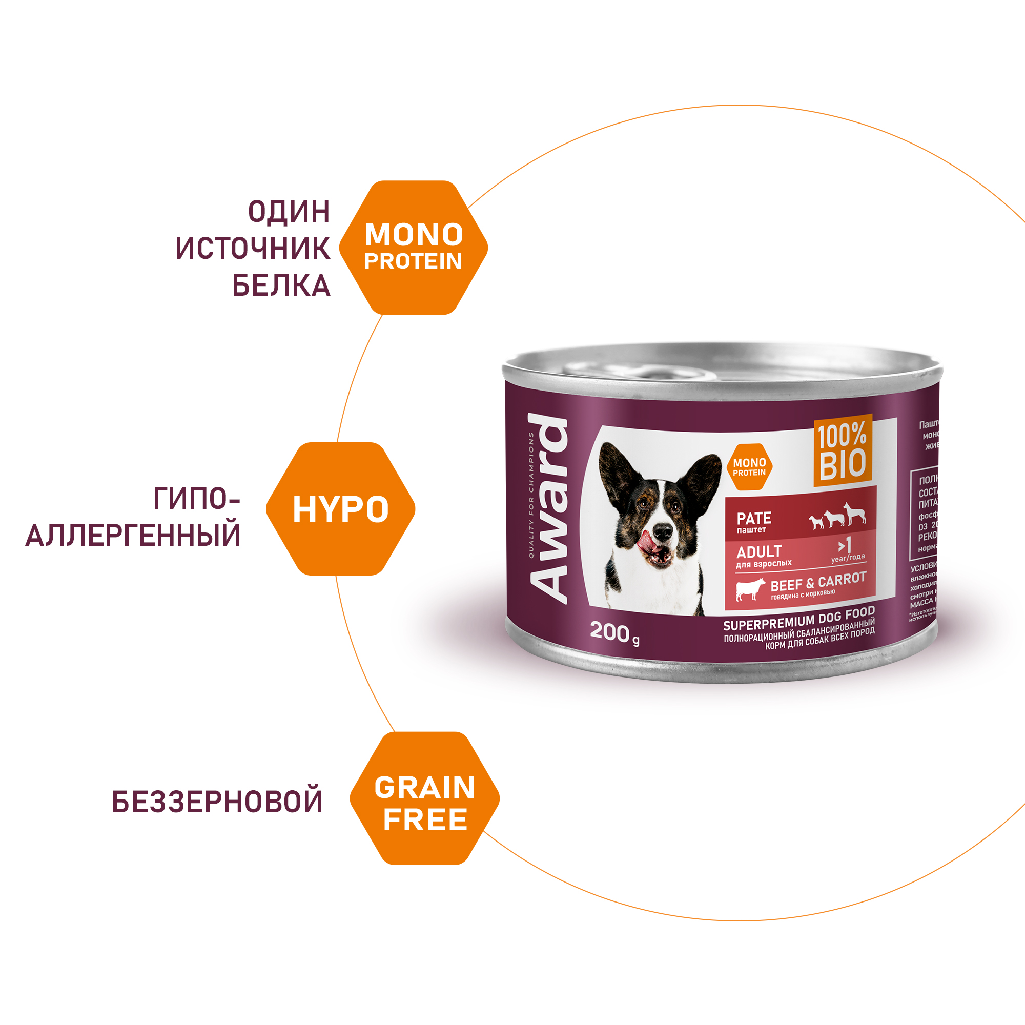 Влажный корм AWARD для взрослых собак паштет из говядины с морковью 200г